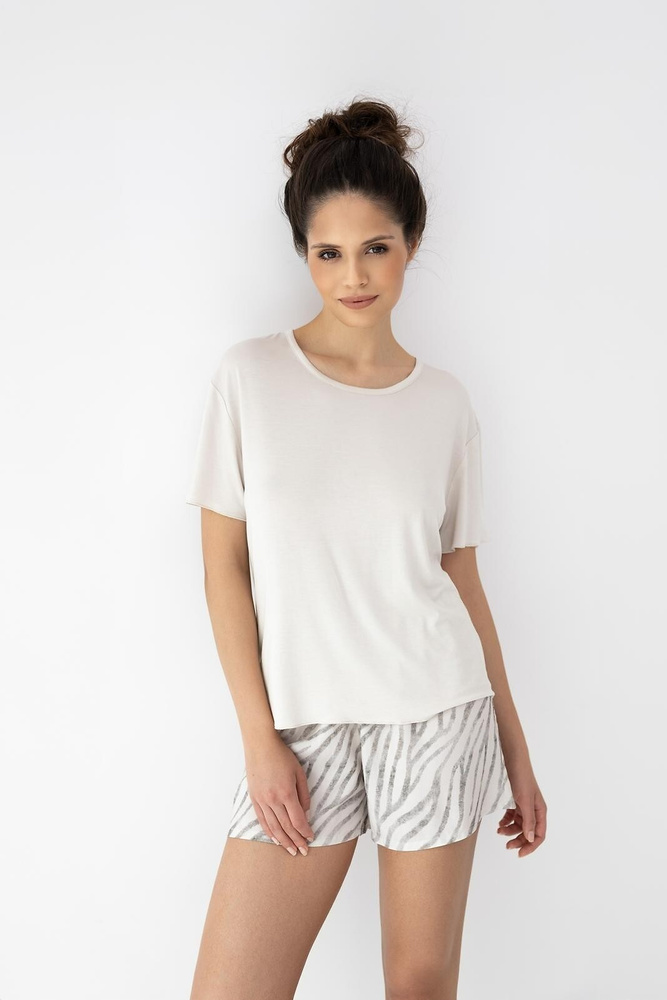 - Lekka piżama damska z przewiewnej wiskozy. Gładka koszulka z krótkim rękawem i półokrągłym dekoltem oraz wzorzyste spodenki tworzą komfortowy, letni komplet do snu i relaksu. Wybierz miękkość, która oddycha razem z Tobą.