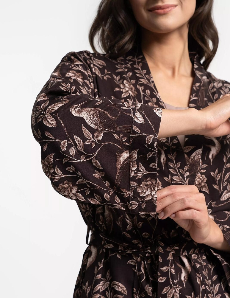 Szlafrok wykonano w całości z 100% wiskozy, która jest miękka, gładka i oddychająca. Dzięki temu dobrze układa się na sylwetce i zapewnia wysoki komfort noszenia nawet przez wiele godzin. Kwiatowy print dodaje subtelnej elegancji, a krótki fason sprawia, że szlafrok jest lekki wizualnie i praktyczny na co dzień. Wiązanie w pasie pozwala łatwo dopasować go do figury, a dwie boczne kieszenie zwiększają funkcjonalność – idealne na telefon lub drobiazgi.