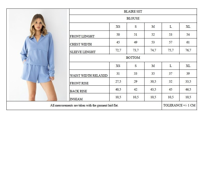 Komplet składa się z bluzy o luźnym kroju oraz komfortowych szortów z wysokim stanem. Góra została zaprojektowana w designerskim stylu z charakterystycznym kołnierzykiem typu polo oraz dekoltem w serek, który optycznie wysmukla szyję i nadaje sylwetce lekkości. Ozdobne przeszycie na linii biustu tworzy subtelny, geometryczny akcent, dzięki czemu bluza wygląda nowocześnie i stylowo.