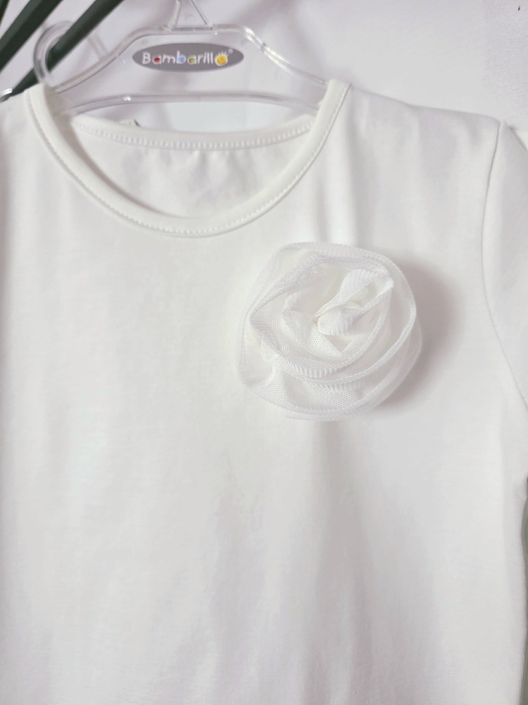 Bluzeczka została wykonana z wysokiej jakości jerseyu, który jest miękki, elastyczny i przyjazny dla skóry dziecka. Materiał dobrze dopasowuje się do sylwetki, nie krępując ruchów, co ma duże znaczenie podczas aktywności w ciągu dnia. Najbardziej charakterystycznym elementem jest ręcznie szyta tiulowa róża, która nadaje całości delikatnego, dziewczęcego charakteru i wyróżnia model spośród klasycznych bluzek.