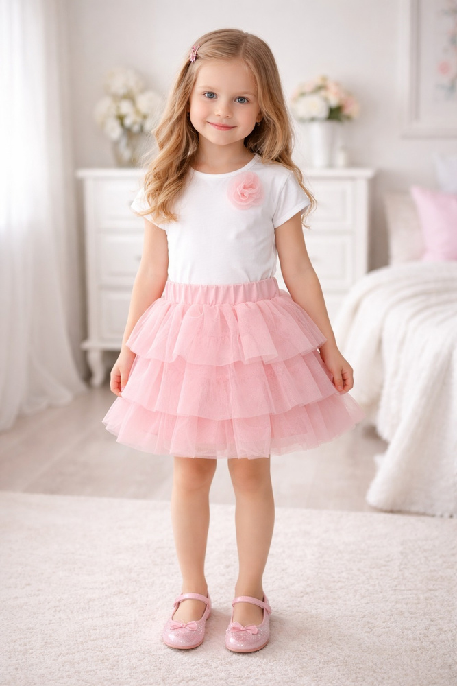 Spódniczka została wykonana z delikatnego tiulu, który tworzy lekko rozkloszowaną formę i nadaje stylizacji objętości, jednocześnie pozostając lekkim i przewiewnym. Podszewka zapewnia komfort noszenia i chroni skórę dziecka przed podrażnieniami. Elastyczna talia dobrze dopasowuje się do sylwetki, dzięki czemu spódniczka nie uciska i pozostaje wygodna przez cały dzień.