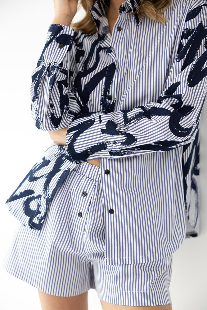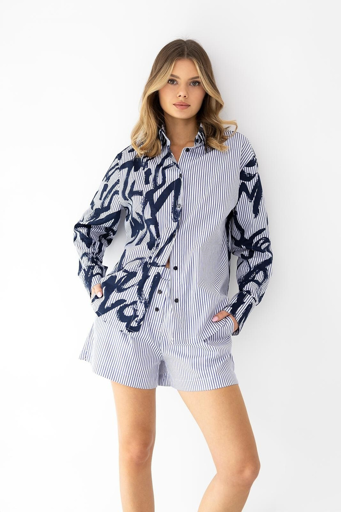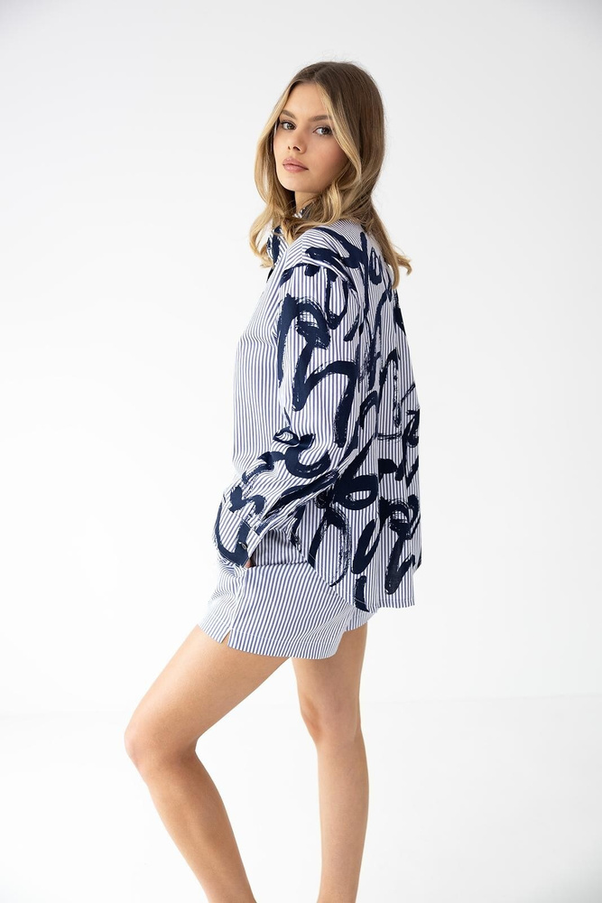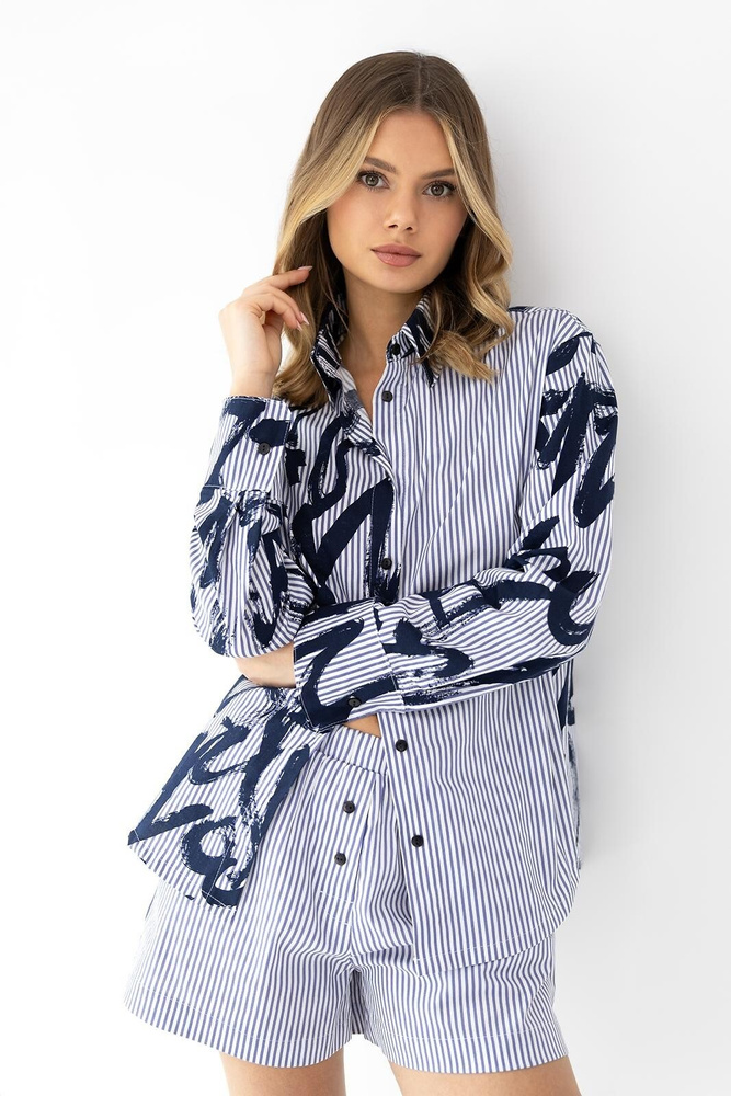 Koszulka z długim rękawem, zapinana na guziki i wykończona klasycznym kołnierzykiem, nadaje całości uporządkowany, lekko elegancki charakter. Subtelny, abstrakcyjny nadruk przełamuje prostotę i dodaje nowoczesnego stylu. Krótkie spodenki z kieszeniami i elastyczną gumką w pasie zapewniają wygodę oraz dobre dopasowanie bez ucisku – to rozwiązanie szczególnie docenią kobiety szukające komfortowej piżamy bawełnianej na co dzień.