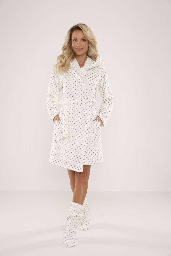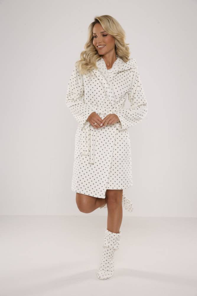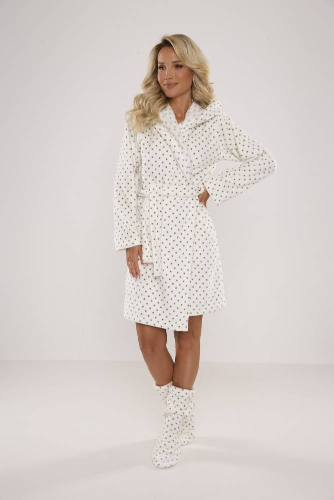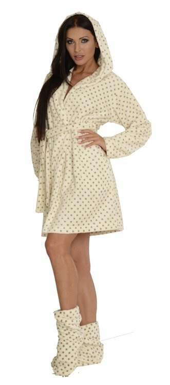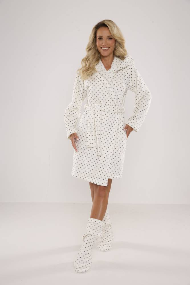 Szlafrok damski firmy FOREX o prostym kroju z kapturem. Długość do kolana, po bokach kieszenie, w pasie wiązany na pasek. Całość w groszki. Szlafrok świetnie dopasowuje się do kształtu ciała, jest niezwykle miękki i lekki, wykonany z dzianiny typu soft. Otulenie się nim po kąpieli to sama przyjemność!