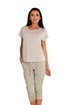 Piżama damska z wysokiej jakości wiskozy. Koszulka w paski z krótkim rękawkiem, tył lekko przedłużony. Jednolite spodnie z kieszeniami o długości 3/4. Nogawki zakończone ściągaczami.