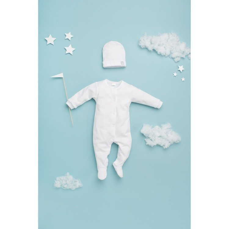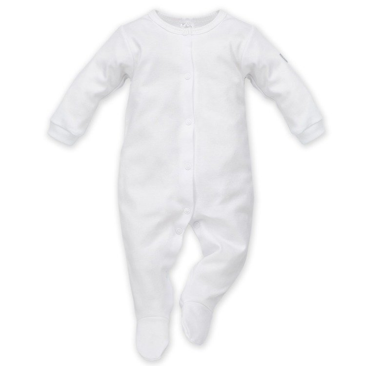 Wygodny, biały pajacyk ze stopkami. Całkowite rozpięcie z przodu i w kroku, dopracowany krój, miękka dzianina bawełniana.