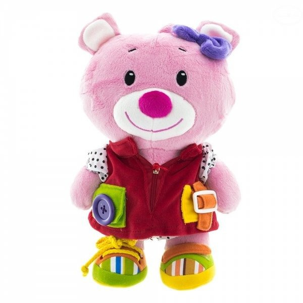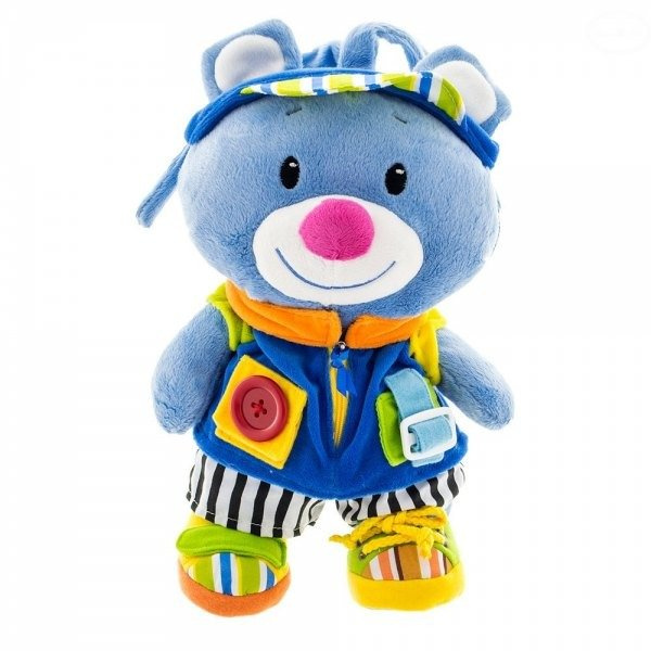Miękka zabawka, która pomoże rozwinąć dziecku zmysł dotyku, wzroku oraz słuchu. Uczy dziecko zapinania bucików na rzepy oraz wiązać sznurówki, zapinać guziki, klamerki, zasuwania zamka. Po pociągnięciu ogonka misiu wydaje dźwięki.
