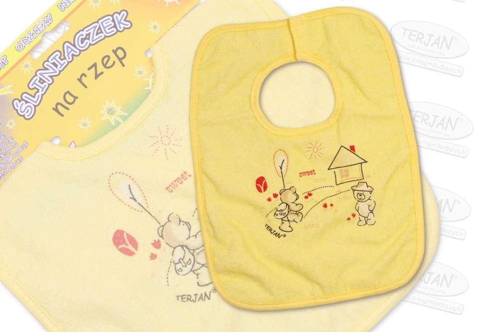 Śliniaczek zamiast tradycyjnego wiązania posiada praktyczne zapinanie na rzep.
