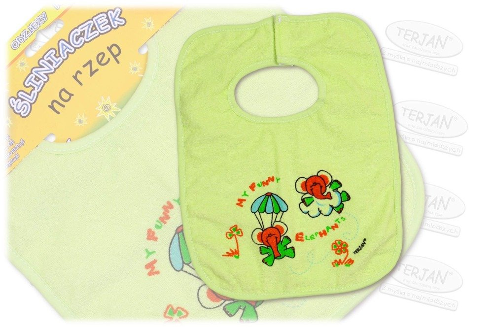 Śliniaczek zamiast tradycyjnego wiązania posiada praktyczne zapinanie na rzep.