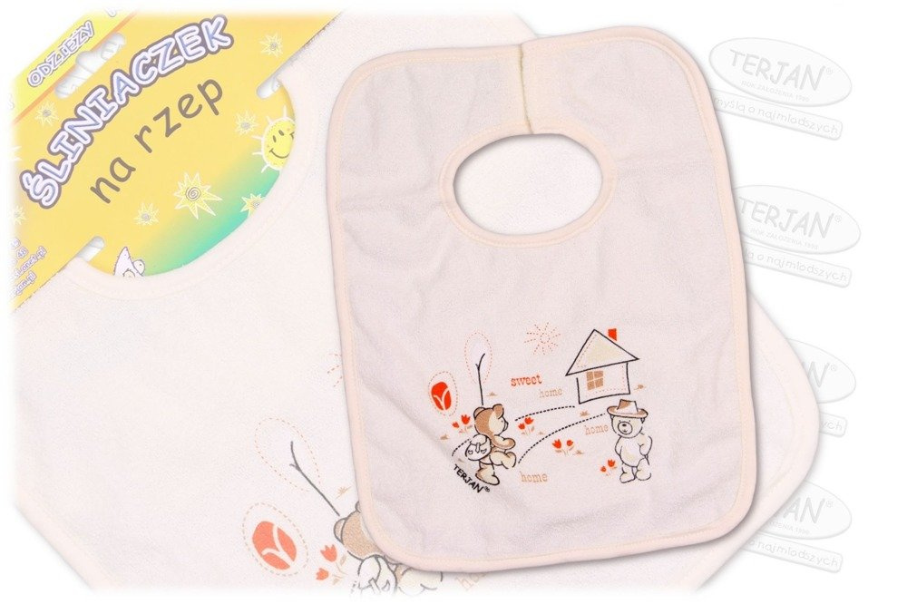 Śliniaczek zamiast tradycyjnego wiązania posiada praktyczne zapinanie na rzep.