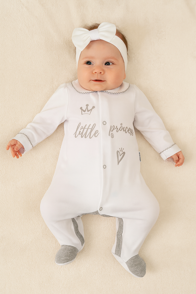 Uroczy pajacyk dla małej księżniczki ,wykonany z wysokogatunkowej bawełny.