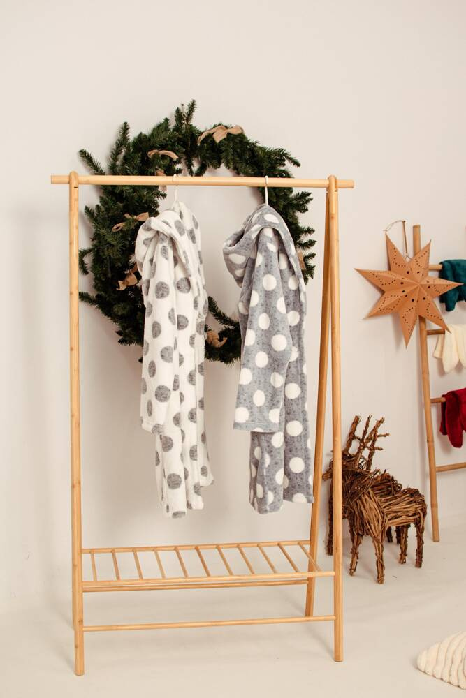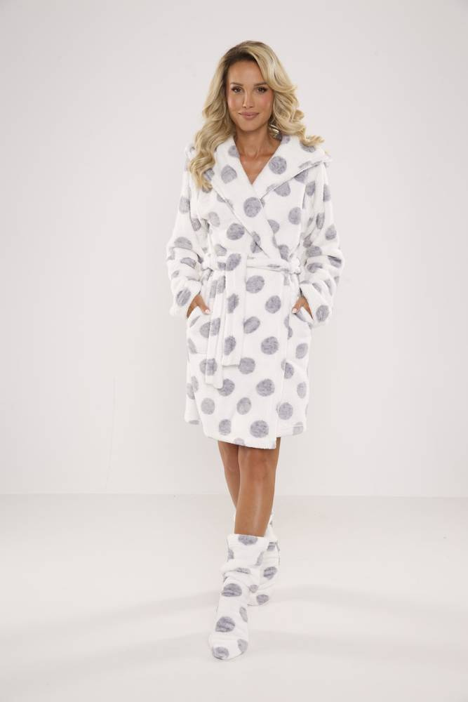 Krótki szlafrok damski z kapturem, z miękkiej dzianiny typu soft w duże kropki. Wiązany w pasie, z kieszeniami. Główną zaletą tego modelu jest cieplutka i miła w dotyku pluszowa tkanina. JEST TO PRODUKT WYSOKIEJ JAKOŚCI BARDZO DOBRZE WCHŁANIAJĄCY WODĘ !!!