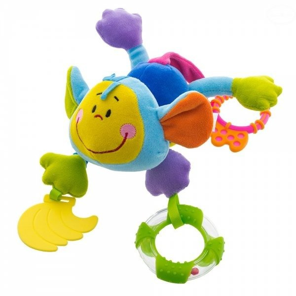 Sympatyczna, miękka małpka, która umili czas zabawy każdemu maleństwu. Do łapek doczepione są kolorowe grzechotki i gryzaczki. Dzięki różnym materiałom z których jest wykonana pomoże rozwinąć dziecku zmysł dotyku, wzroku oraz słuchu. Dostępne są dwie wersje kolorystyczne: niebieska i zielona.