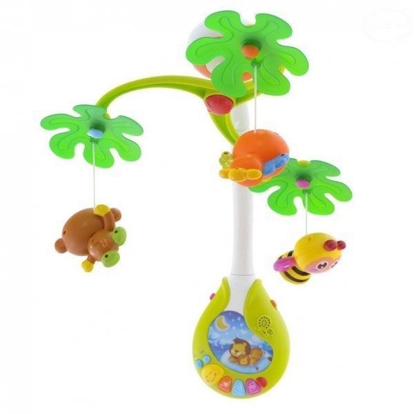Zabawka Karuzela Dżungla firmy Eurobaby to interaktywny produkt opracowany specjalnie dla niemowlaków. Zaprojektowana jest ona w taki sposób, by pobudzać rozwój małego dziecka już od pierwszych chwil jego życia. Zabawka posiada trzy bajkowe zwierzątka ( małpkę, ptaszka oraz pszczółkę) podwieszone pod listkami. Ramię karuzeli jest specjalnie wyprofilowane, aby zabawki, obracając się tworzyły efekt podnoszenia się i opadania. Dzięki pasom z automatyczną blokadą karuzelę można w prosty i wygodny sposób przymocować do łóżeczka. Z łatwością można wybrać spośród trzech trybów pracy urządzenia:
