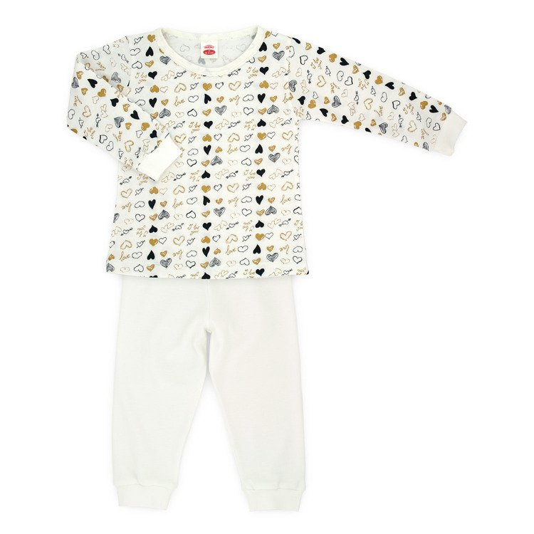 Bawełniana piżamka niemowlęca. Wykonana z mięciutkiej bawełny. Bluzka ozdobiona w kolorowe serduszka. Spodnie proste w kolorze ecru, zakończone ściągaczami.