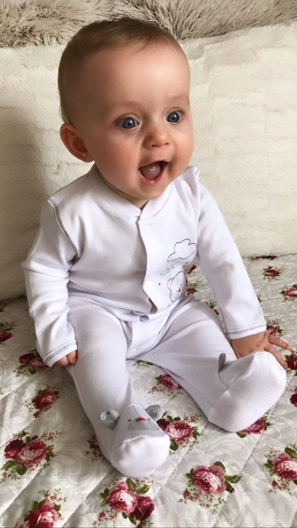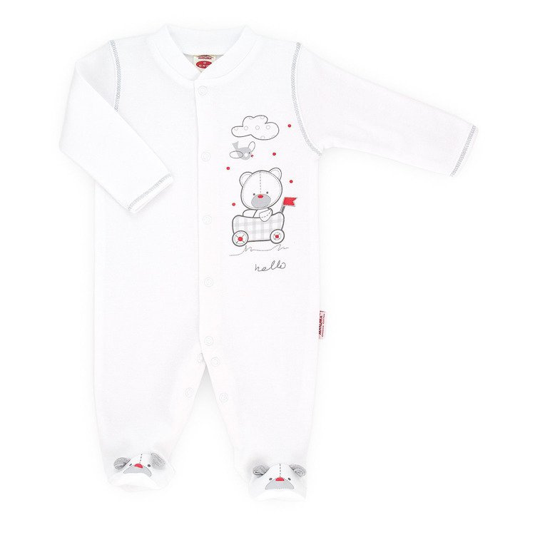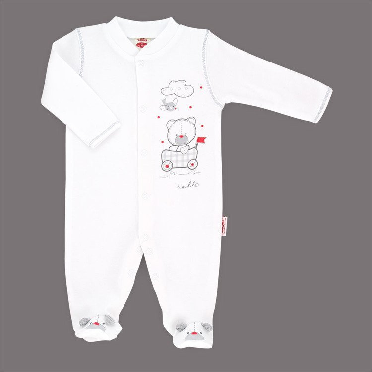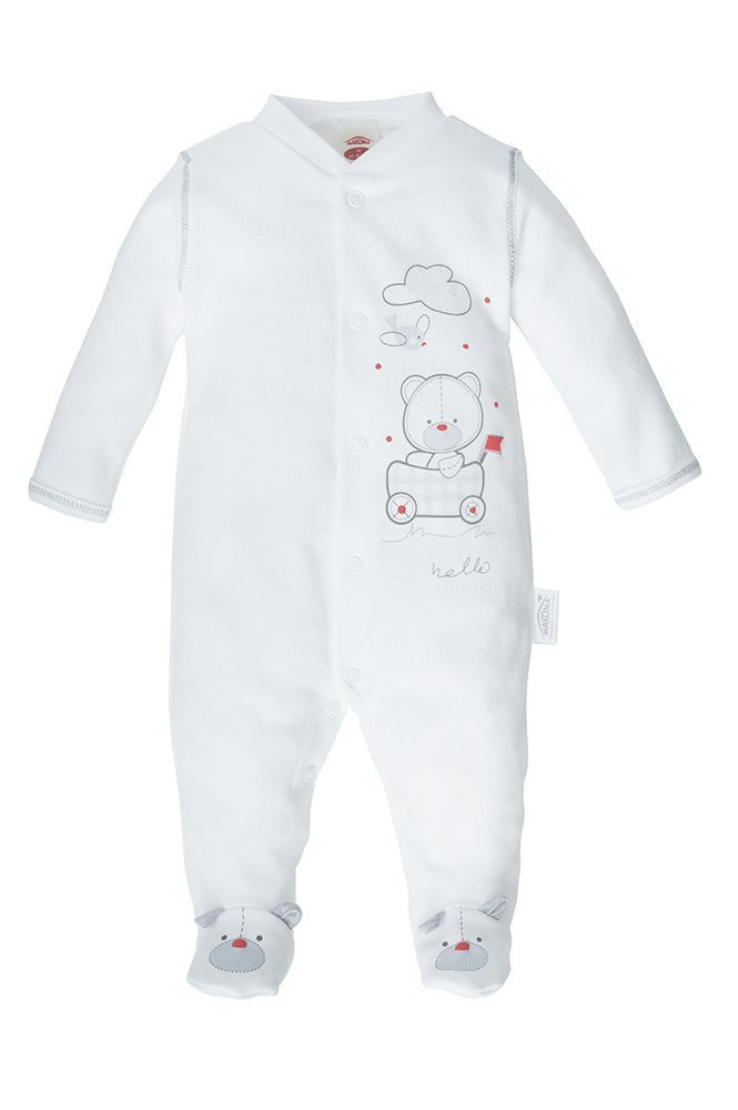 Bawełniany pajac w kolorze białym. Możliwość całkowitego rozpięcia umożliwia łatwe i szybkie ubieranie dziecka. Zapewnia swobodę użytkowania i nie krepuje ruchów dziecka. Dostępny w rozmiarach 56-68.