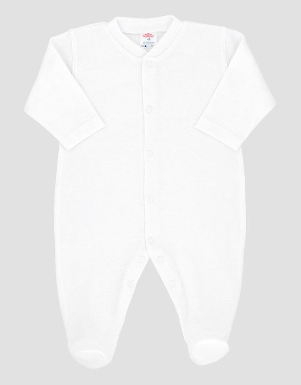 Bawełniany pajac w kolorze białym. Możliwość całkowitego rozpięcia umożliwia łatwe i szybkie ubieranie dziecka. Zapewnia swobodę użytkowania i nie krepuje ruchów dziecka. Dostępny w rozmiarach 50-80.