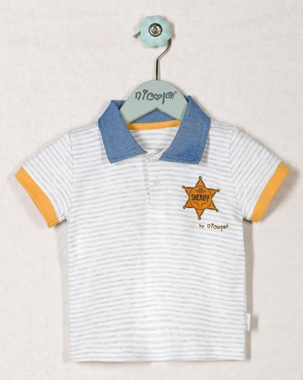 Bluzka bawełniana. Ubranko przyozdobione jest naszywką "Sheriff". Kołnierzyk w kolorze jeansu, wykończenie rękawków musztardowe.