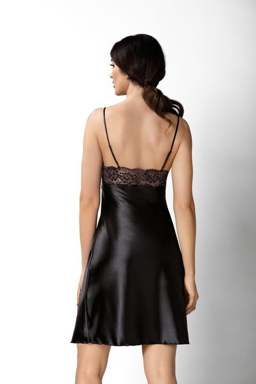 Damska koszulka nocna, uszyta z wysokiej jakości satyny. Na biuście tiulowa siateczka ozdobiona delikatnym jasno różowym haftem, podszyta tkaniną.