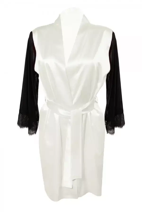 Elegancki i niezwykle seksowny szlafroczek z delikatnej satyny. Tiulowe rękawy wykończone koronką, dodają mnóstwo pikanterii. Praktyczne wiązanie w pasie idealnie dopasowuje się do sylwetki, uwydatniając atuty kobiecego ciała