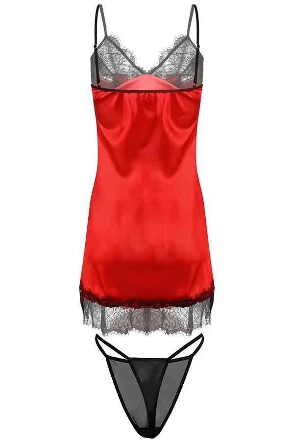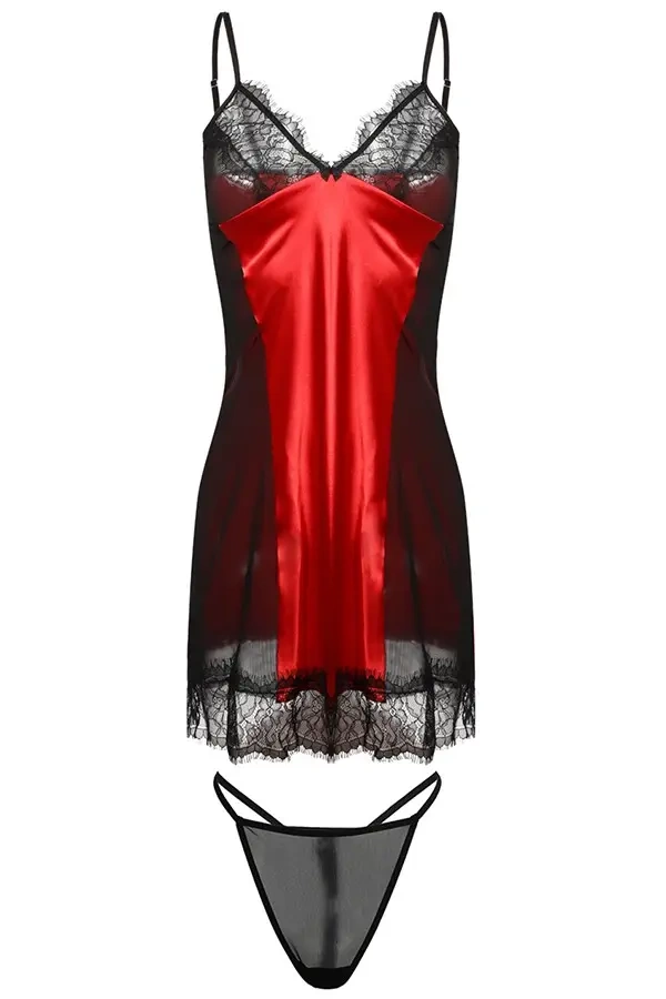 Satynowa zwiewna, zmysłowa haleczka ze stringami. Dół halki oraz miseczki wykończone są przyjemną w dotyku koronką, boki koszulki wykonane z przejrzystego tiulu.