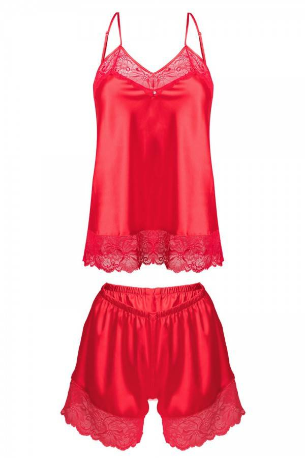 Satynowy niezwykle seksowny komplet Brenda firmy DKaren. Koszulka i spodenki ozdobione śliczną delikatną koronką. Koronka pod kolor satyny. Komplet wykonany z najwyższej jakości szlachetnej satyny.
