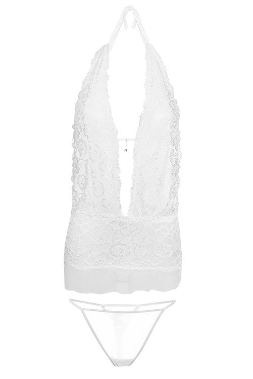 Seksowny komplet dwu częściowy w którego w skład wchodzą koszulka oraz stringi. Koszula wykonana jest z delikatnej elastycznej, przyjemnej koronki z pogłębionym dekoltem, zdobionym biżuteryjną symilką. Tył odcięty od pasa, wiązana na szyi oraz dodatkowo na plecach. Dół wykończony delikatnym tiulem. Dostępna wersja kolorystyczna: czerwony, czarny, ecru.