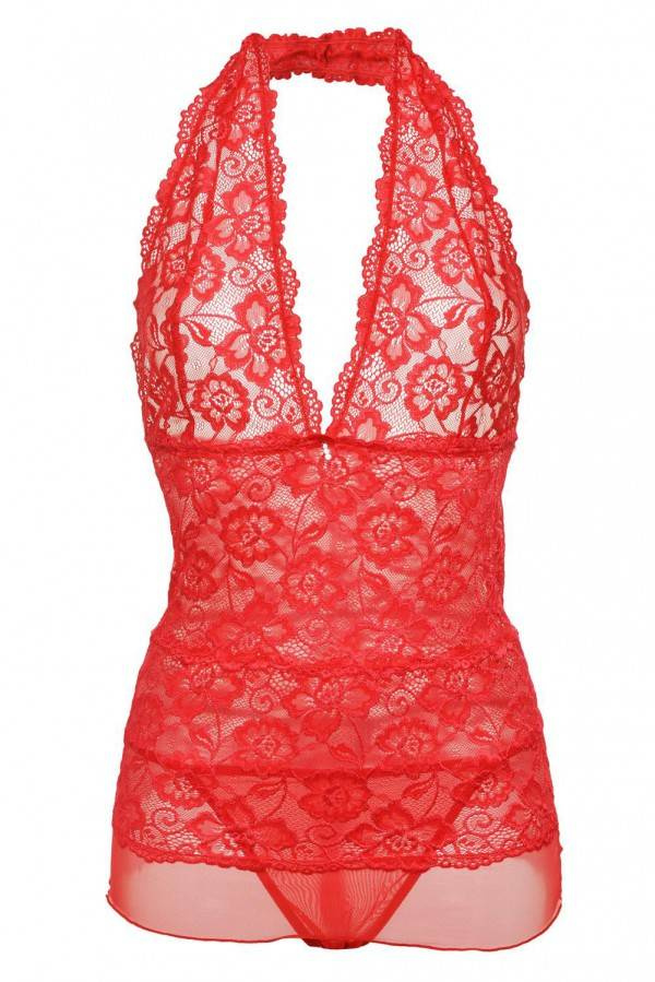 Seksowny komplet dwuczęściowy, w którego skład wchodzą koszulka oraz stringi. Koszulka wykonana z delikatnej koronki z głębokim dekoltem zdobiony biżuteryjną symilką. Koszulka jest przekładana przez głowę oraz wykończona tiulem.