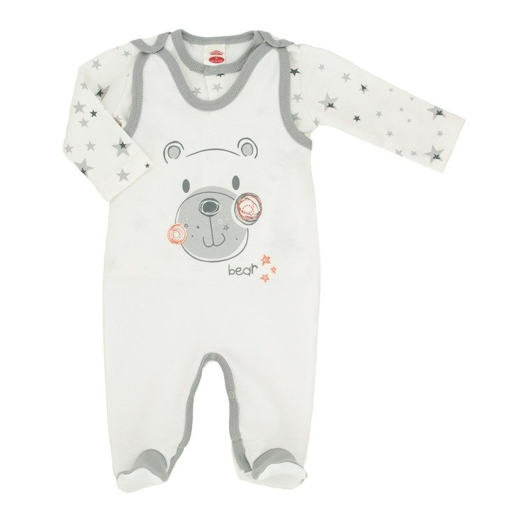Komplet dla niemowlaka składający się ze śpioszków i kaftanika. Idealny zestaw dla maluszka w pierwszych miesiącach życia. W kolorze biało-szarym, z misiem na środku śpiocha. Wykonany z najwyżej jakości bawełny.