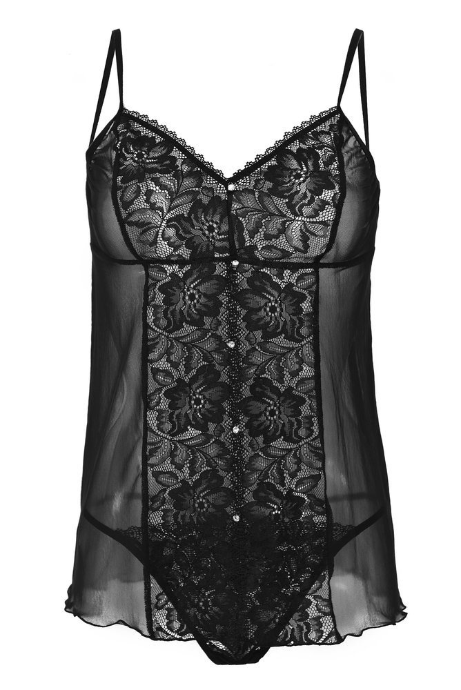 Miseczki halki profilowane, na środku rozcięcie z ozdobną biżuterią, Ramiączka cienkie i regulowane, dzięki czemu długość koszulki można dopasować wedle własnego komfortu. Komplet wykonany z najwyższej jakości tkaniny.