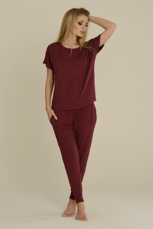 Piżama damska z wysokiej jakości wiskozy z dodatkiem elastanu. Koszulka o luźnym fasonie z krótkim rękawem typu reglan. Spodnie długie z kieszeniami, nogawki zakończone ściągaczem.