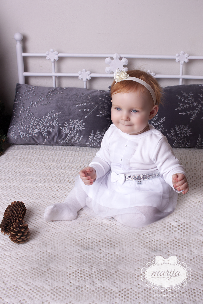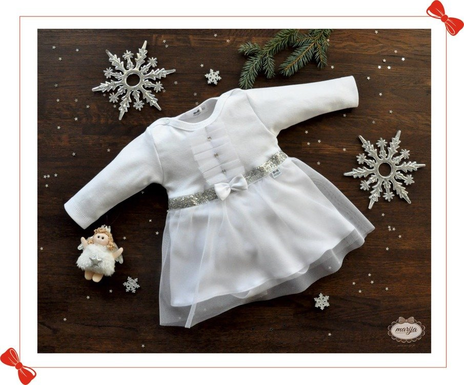 Urocze, dziewczęce sukienko-body, wykonane z 100% bawełny. Model zdobi srebrny pasek oraz tiul. Zapinane na bezniklowe napki. Model bardzo ładnie komponuje się z pozostałymi ubrankami z kolekcji Little Star.