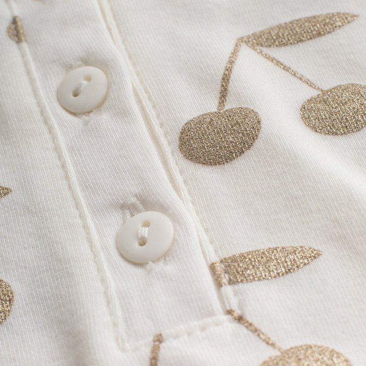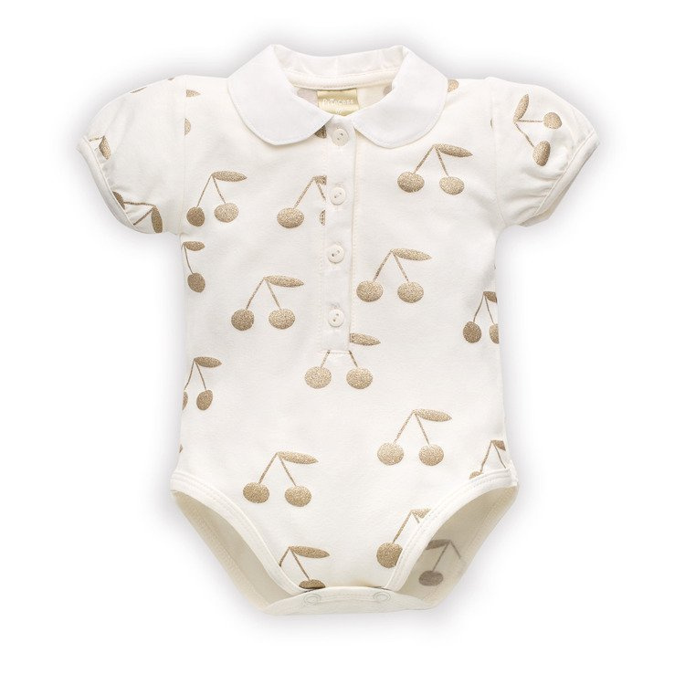 Gustowne i eleganckie body w kolorze écru wykończone uroczym kołnierzykiem przy szyjce. Wykonane z bawełny najwyższej jakości, ozdobione złotym, połyskującym nadrukiem wisienek. Zapinane w kroczku na bezniklowe napki, które nie uczulają dziecka. Dodatkowym atrybutem tego ubranka są ozdobne guziczki, ułatwiające zakładanie i zdejmowanie ubranka. Body będzie się doskonale prezentować w wielu codziennych i gościnnych stylizacjach.