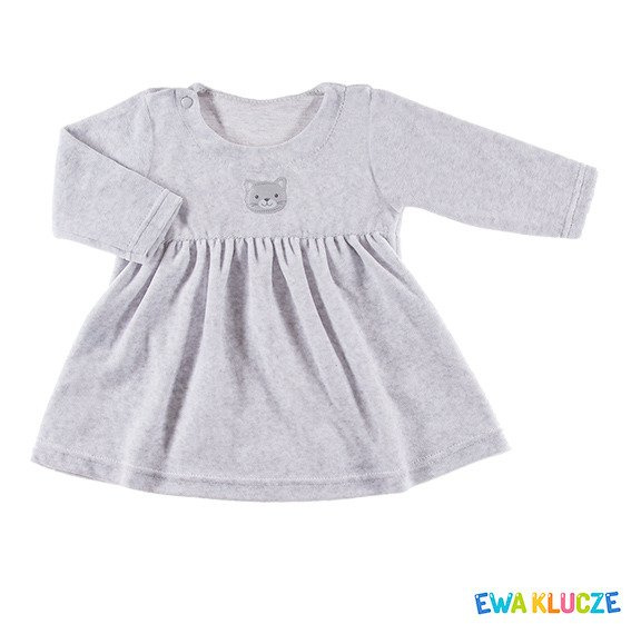Sukienka z kolekcji "True love" w dwóch wersjach kolorystycznych uszyta z miękkiego i przyjemnego w dotyku pastelowego weluru. Z przodu znajduje się naszywka przedstawiająca wesołe zwierzątko, zabezpieczona od wewnątrz, tak aby nie podrażniała delikatnej skóry dziecka. Krój umożliwia całkowite rozpięcie, przez co ubranko jest funkcjonalne i wygodne. Użyte napki nie zawierają niklu