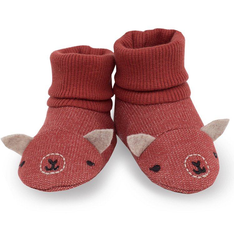 Lekkie, wykonane ze 100% bawełny buciki w kolorze czerwonym. Ich charakterystyczny krój przypomina małe lamy, a szczególnego uroku dodają im odstające, milutkie uszka i podwinięty ściągacz na szczycie.