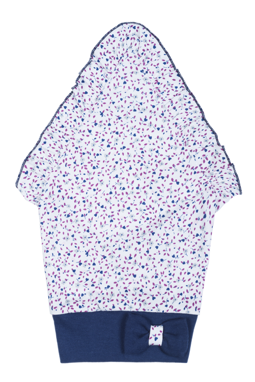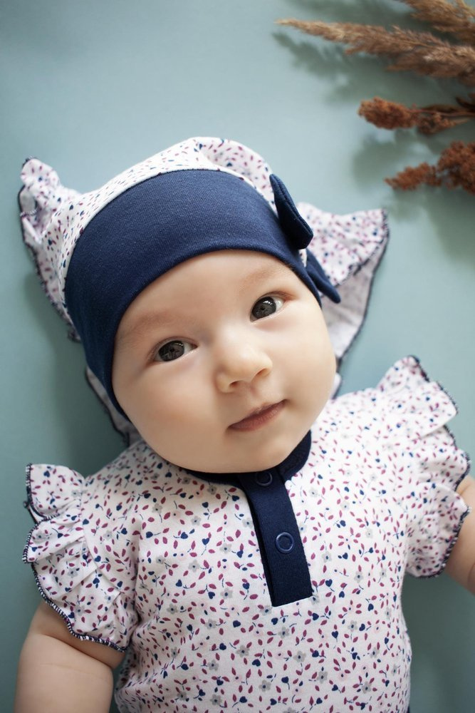 Wykonana z wysokogatunkowej bawełny, delikatna i przyjemna w dotyku chustka. Występuje w kolorze granatowym, a jej elementem charakterystycznym jest wzór w kwiatki. Ten mały dodatek bardzo dobrze chroni gówkę dziecka podczas spacerów.