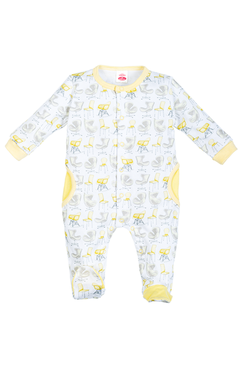 Bawełniany pajac z nadrukiem krzesełek. Możliwość całkowitego rozpięcia umożliwia łatwe i szybkie ubieranie dziecka. Zapewnia swobodę użytkowania i nie krepuje ruchów dziecka. Dostępny w rozmiarach 56-80.