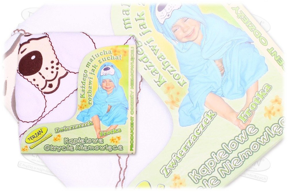 Okrycie wykonane z mięciutkiej i chłonnej frotki, 100 % bawełna. Obszyte lamówką. Model z kapturkiem, który chroni główkę maluszka przed zimnem. Na kapturku znajduje się śliczny haftowany motyw. Zadowolenie i bezpieczeństwo naszych milusińskich jest dla nas najważniejsze.