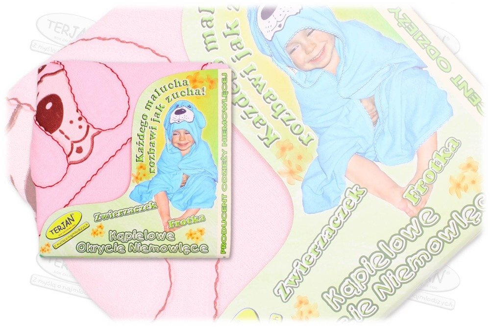 Okrycie wykonane z mięciutkiej i chłonnej frotki, 100 % bawełna. Obszyte lamówką. Model z kapturkiem, który chroni główkę maluszka przed zimnem. Na kapturku znajduje się śliczny haftowany motyw. Zadowolenie i bezpieczeństwo naszych milusińskich jest dla nas najważniejsze.