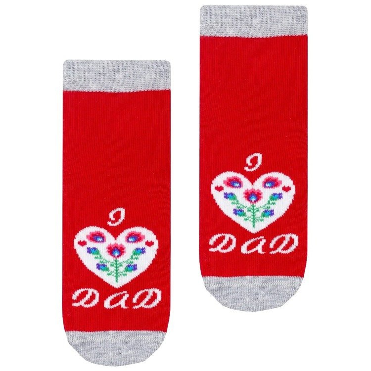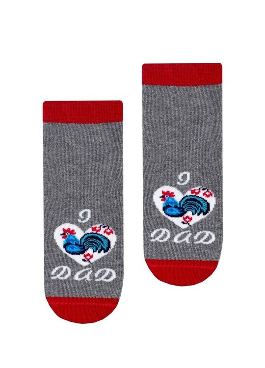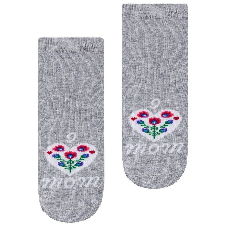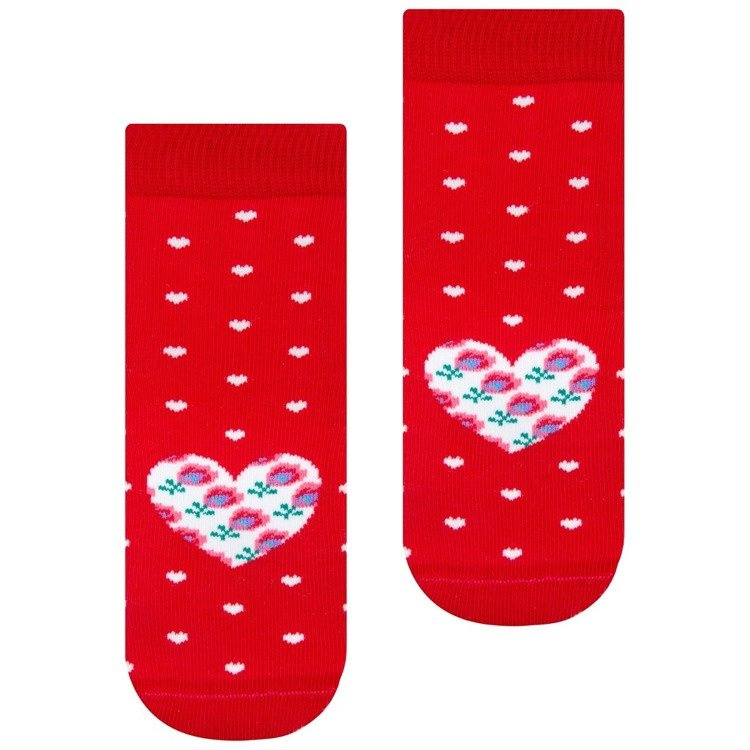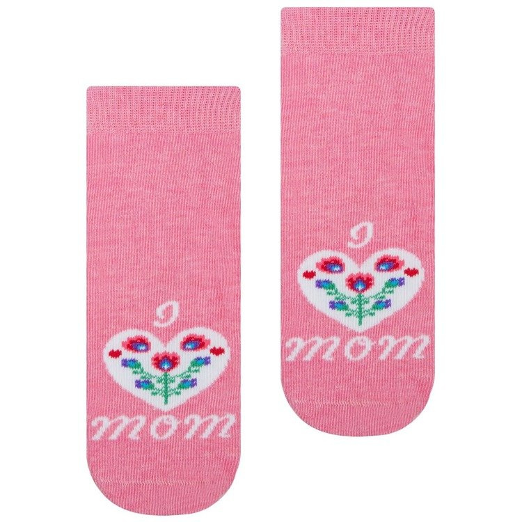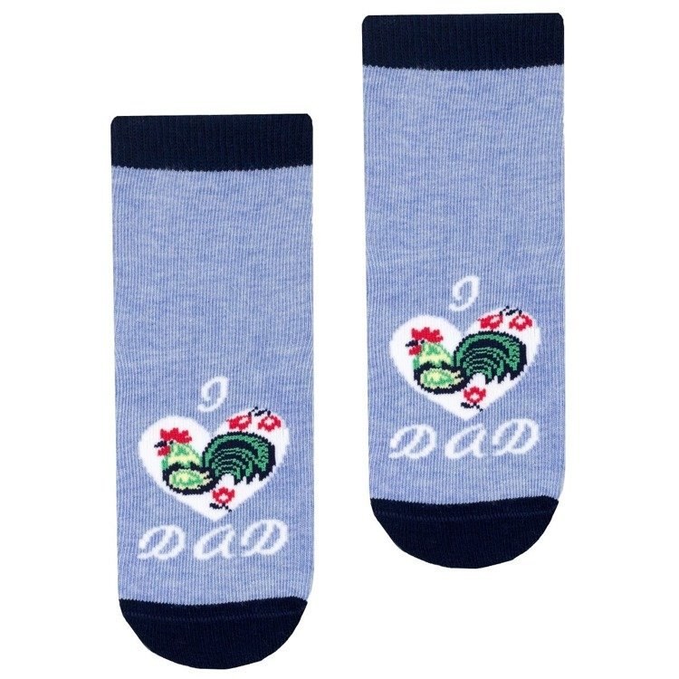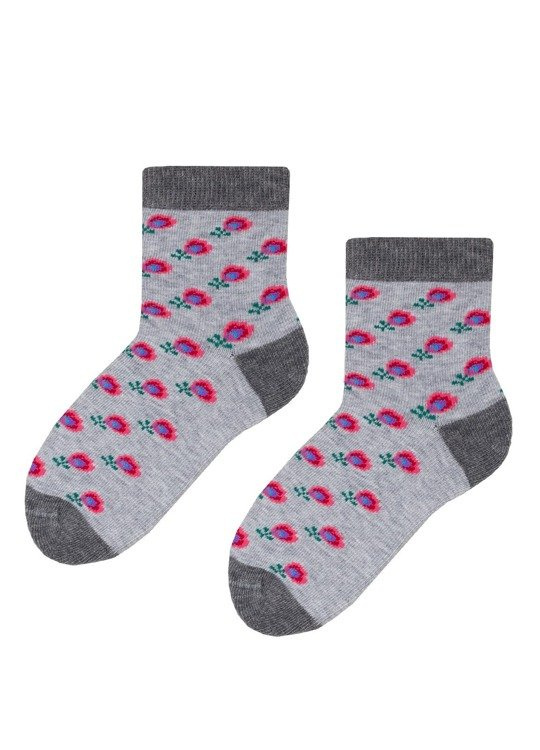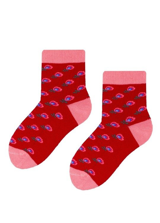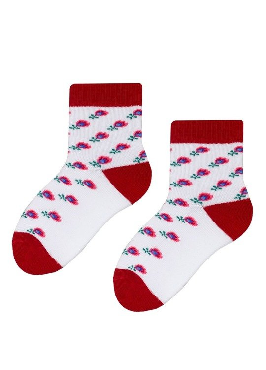 Skarpety bawełniane dziecięce z dodatkiem włókien elastycznych orazz kolorowym, folkowym wzorem. Posiadają delikatnie przylegający ściągacz i płaski szew dzięki czemu gwarantują komfort noszenia.