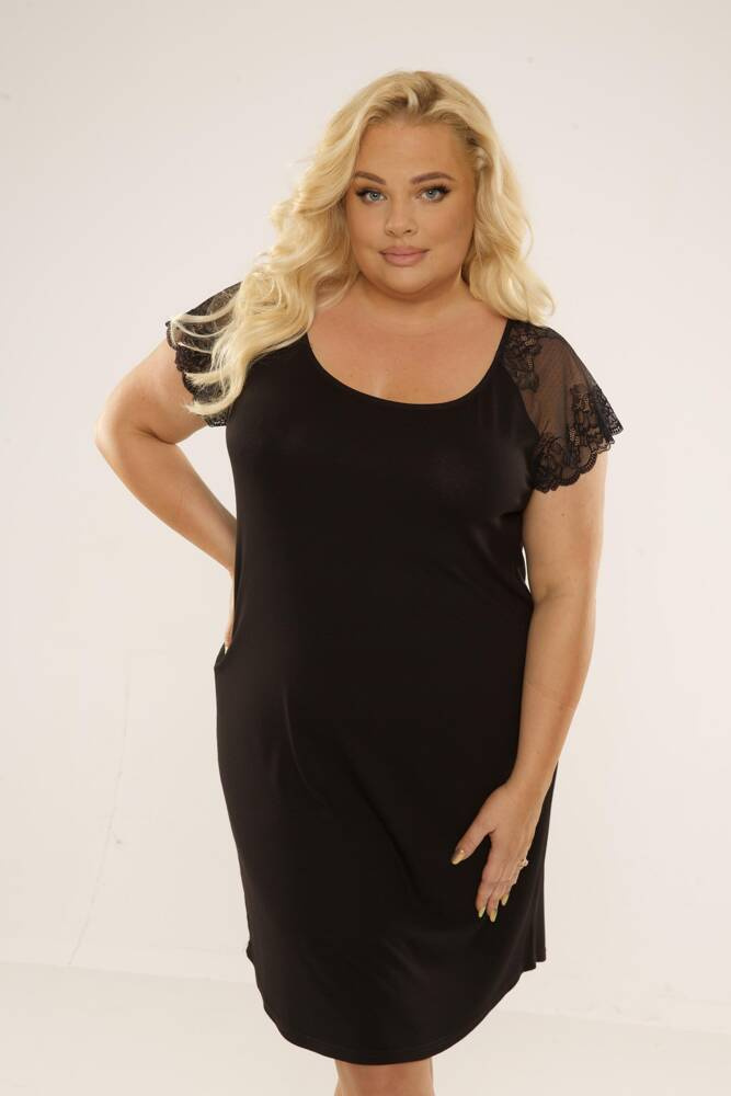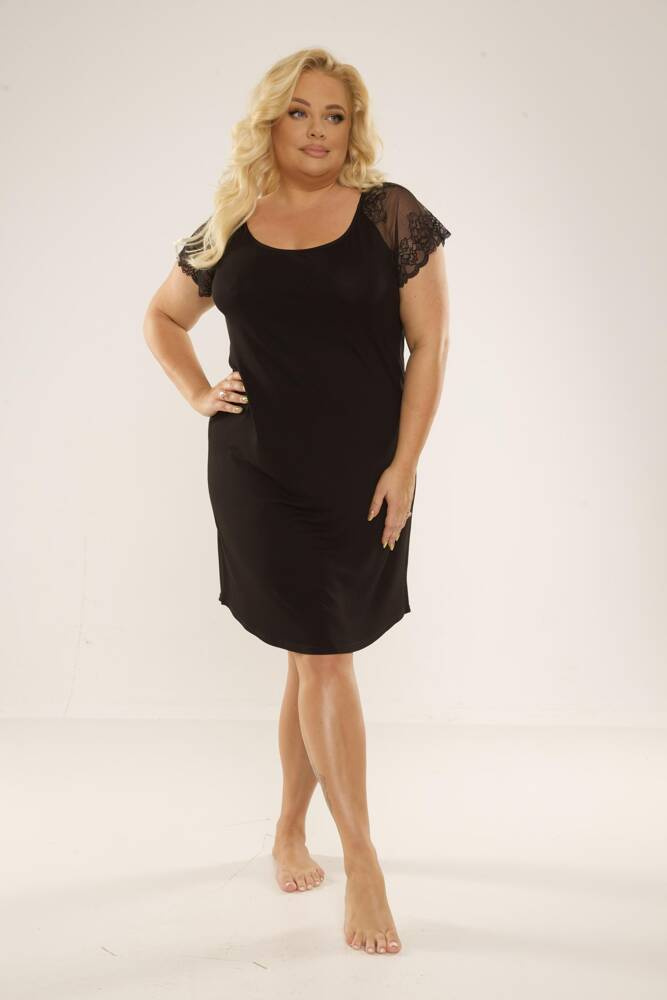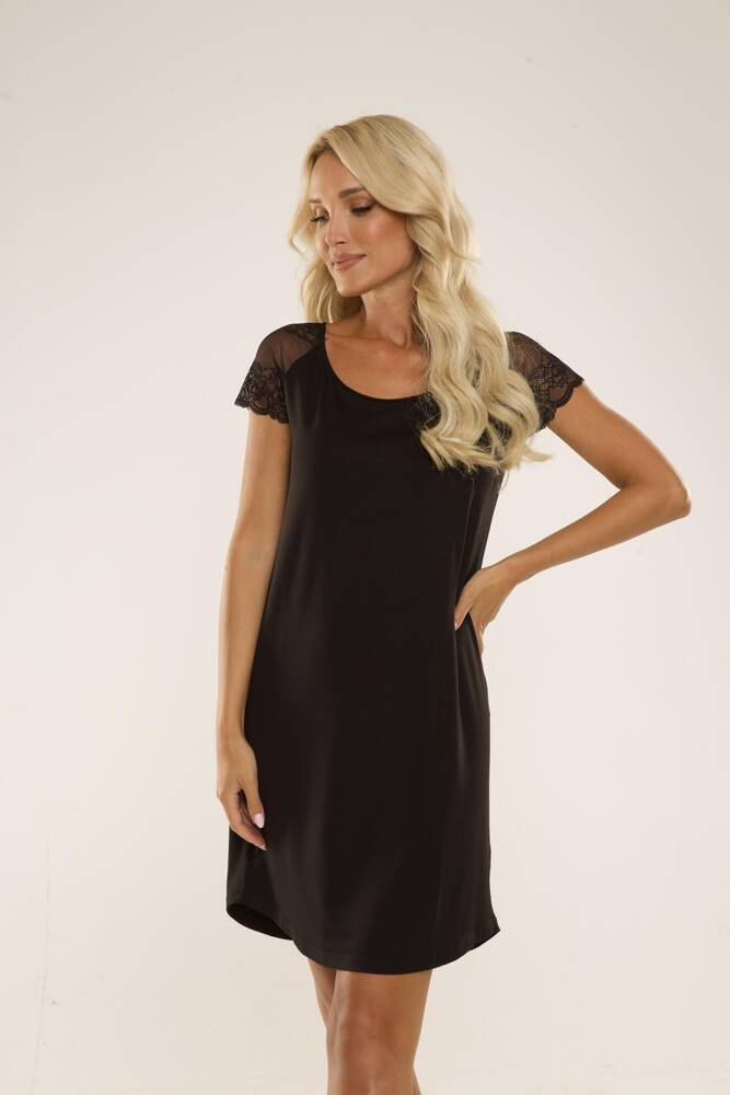 Koszula damska, z wysokiej jakości wiskozy, z krótkim rękawem. Dekolt w kształcie łódeczki. Rękawki zdobi efektowna, ażurowa koronka o kwiatowym motywie. Długość do kolan.