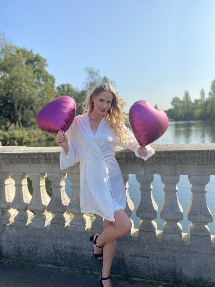 Szlafrok damski z wysokiej jakości wiskozy 94% z dodatkiem elastanu. Krótki, wiązany w pasie, z rękawem 3/4. Model ozdobiony efektownym motywem w serduszka.