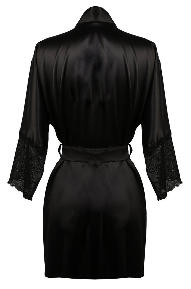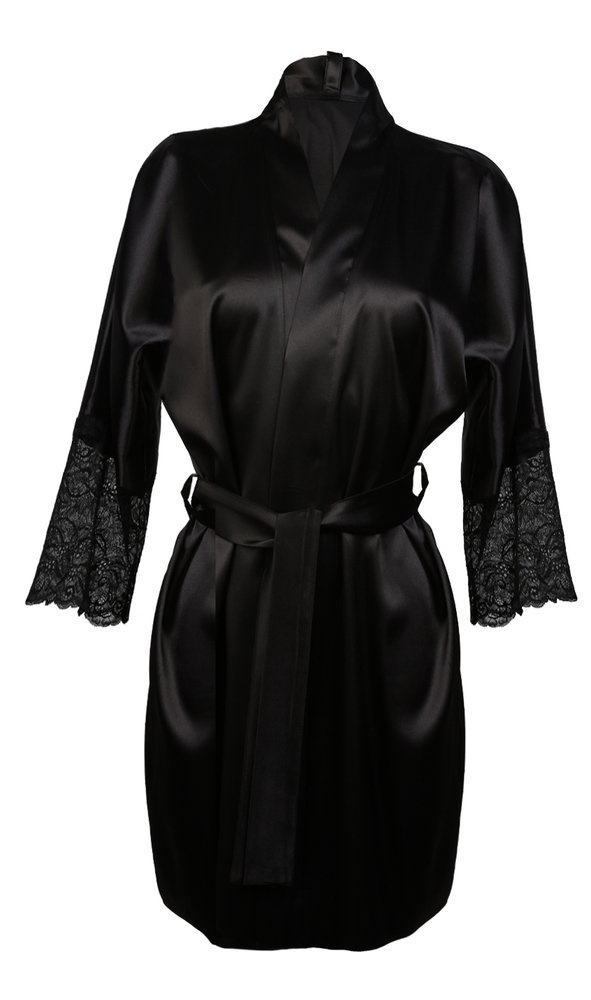 Przyjemny satynowy szlafrok. Rękaw wykończony delikatną koronką, która w całości dodaje uroku i zmysłowości. Przeplatana satynowym paskiem, który idealnie dopasowuje się do sylwetki.