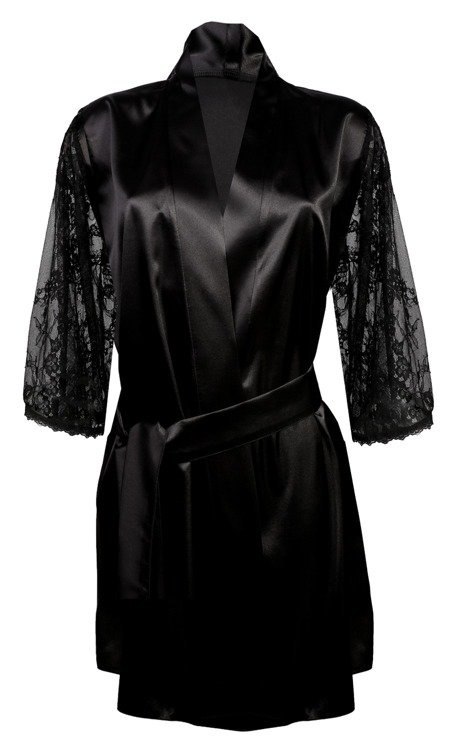 Przyjemny, elegancki satynowy szlafrok. Wykończony długimi rękawami z delikatnej koronki.