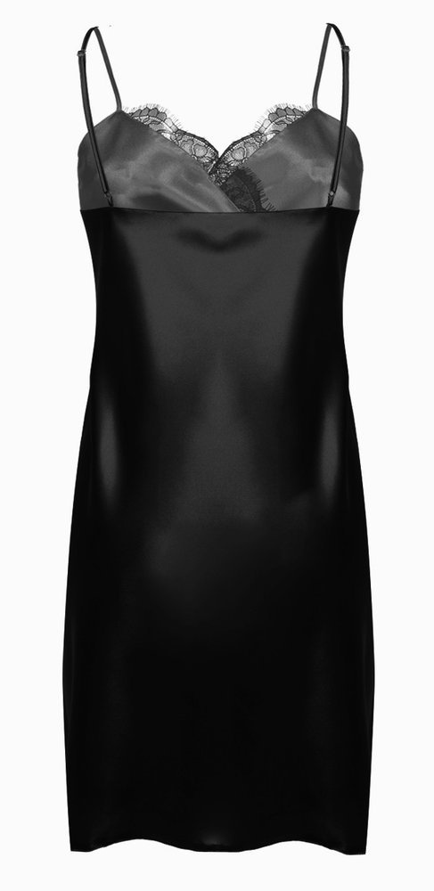 Koszulka wykonana z zwiewnej satyny. Trójkątne miseczki z satyny zmysłowo eksponują dekolt. Całość uzupełnia koronka która jest podszyta pod biustem oraz na miskach. Ramiączka cienkie, regulowane.