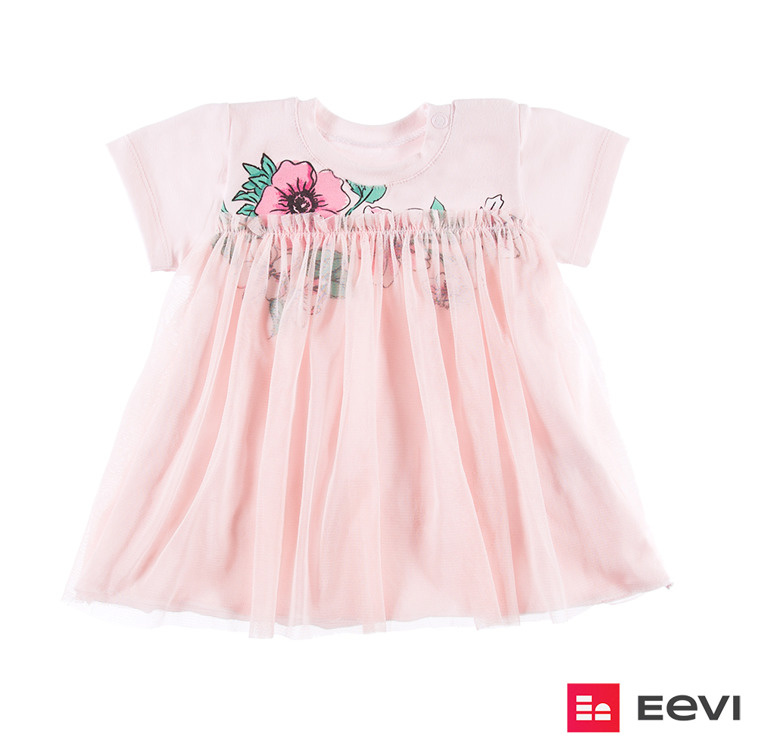 Letnia sukienka z kolekcji "FLOWER" wykonana z miękkiej i przyjemnej w dotyku dzianiny bawełnianej w połączeniu z delikatnym tiulem. Wykończona przy szyjce miękką lamówką. i