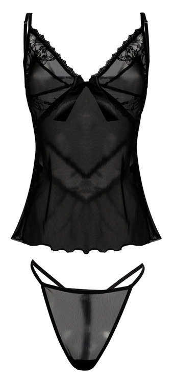 Uwodzicielski komplet tiulowy składający się z dwóch części. Góra koszulki uszyta z delikatnego tiulu całość dopełnia przepiękna koronka z przodu i z tyłu. Do kompletu są dołączone stringi.