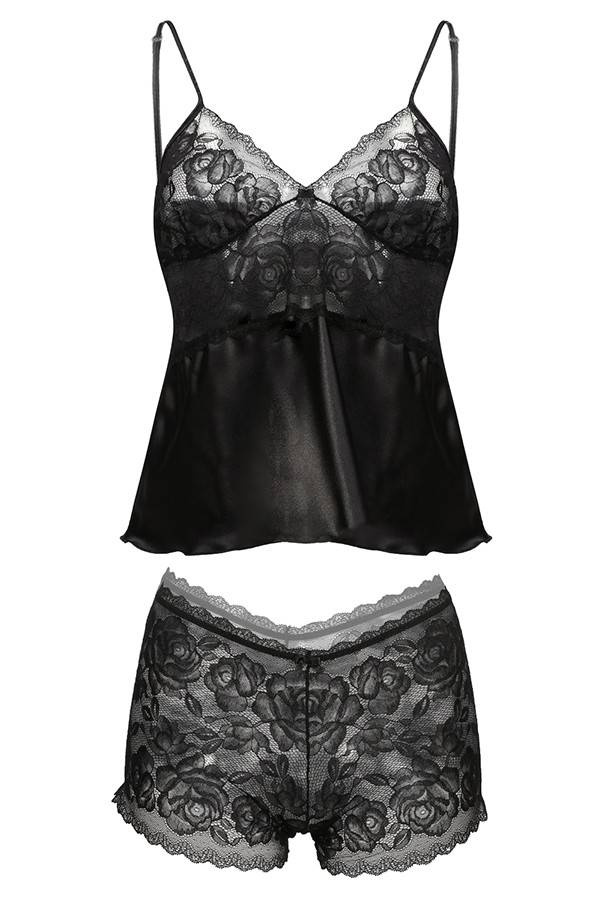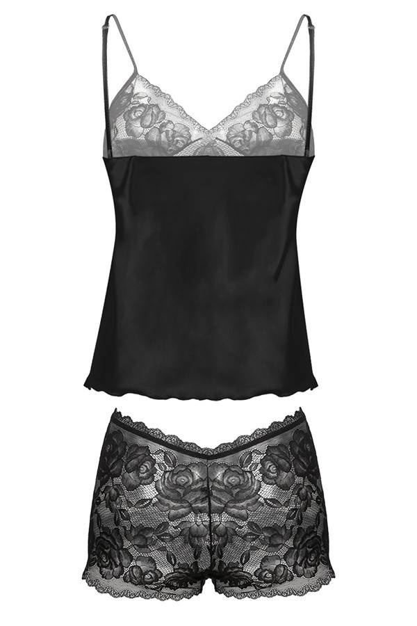 Góra koszulki uszyta z elastycznej koronki wzór różyczek, dół natomiast został wykonany z delikatnej satyny. Ramiączka cienkie regulowane. Bokserki na cienkiej gumce uszyte z elastycznej koronki.