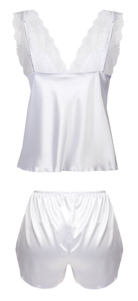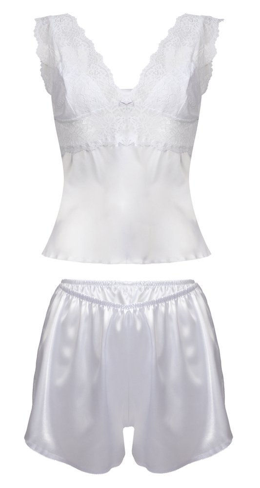 Satynowy dotyk. Komplet składa się z koszulki oraz spodenek. Koszulka wykonana z zwiewnej satyny natomiast góra wykończona wzorzystą koronką, miseczki podszyte satyną kryjąc nasze atuty.