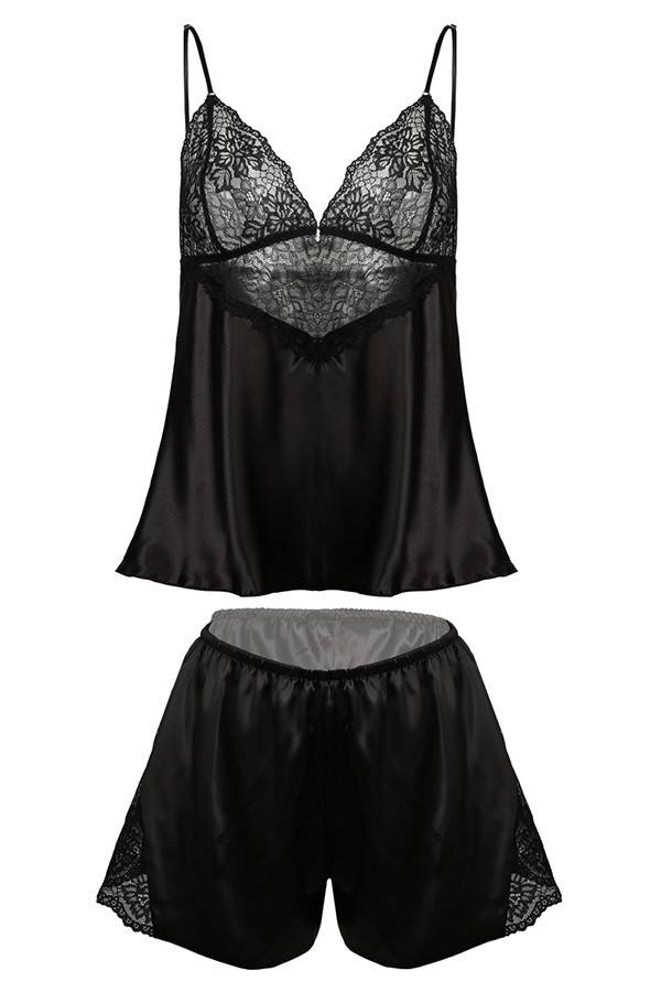 Spodenki satynowe po boku wszyty trójkąt z koronki. Ramiączka cienkie regulowane.