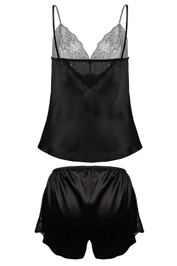 Satynowy komplecik który składa się koszulki oraz spodenek. Góra koszulki zdobi wzorzysta koronka oraz z tyłu został wszyty trójkąt z koronki. Reszta uszyta z zwiewnej satyny.